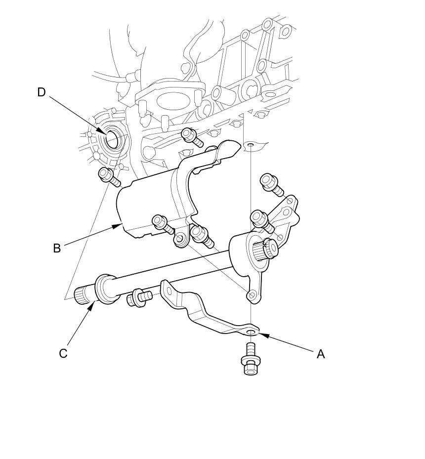 33. Remove the bolt (A) securing the connector bracket (B) from the front cylinder head; use the bracket bolt hole (C) to attach the engine hanger balance bar front arm.