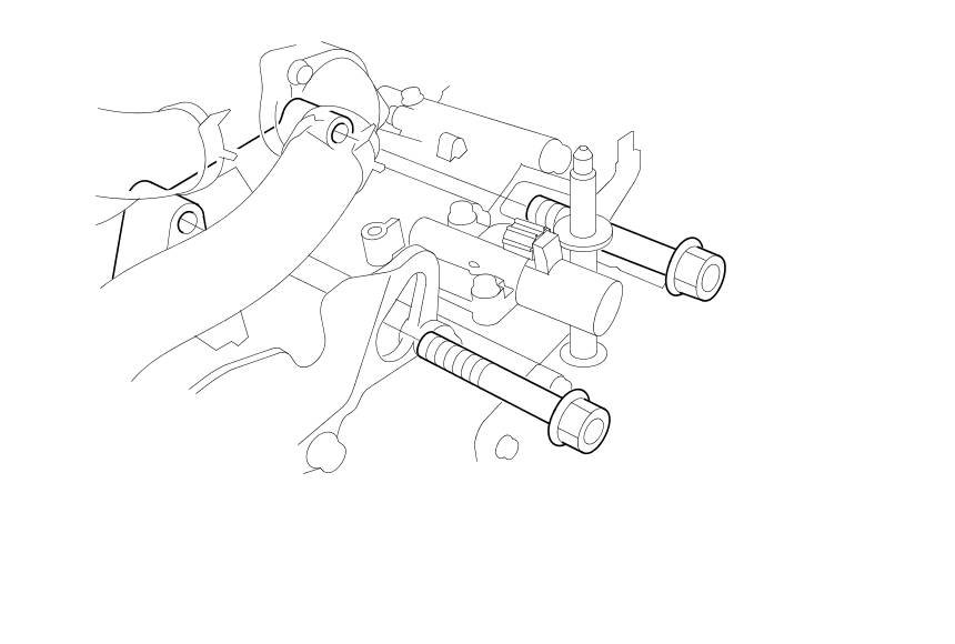 54. Raise a transmission jack and line up the slots in the arms with the bolt holes on the corner of the jack base, then attach them with the bolts.