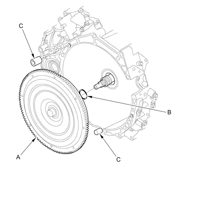 77. Remove the torque converter (A) with the O-ring (B) and the dowel pins (C).