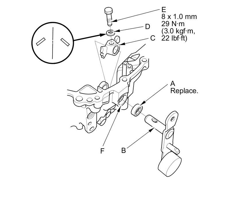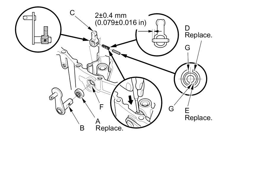 8. Press a new 14 x 20 x 4 mm dust seal (A) into the clutch housing surface, then install the select lever (B), the select arm (C), a new 5 x 22 mm spring pin (D), and a new 3 x 22 mm spring pin (E).