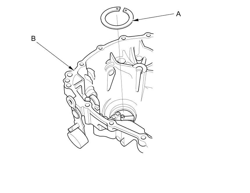3. Select the proper size 82 mm shim (A) according to the measurements made during the Mainshaft Thrust Clearance Adjustment M/T Main shaft Thrust Clearance Adjustment. Install it into the transmission housing (B).