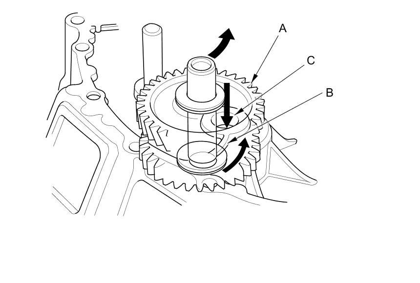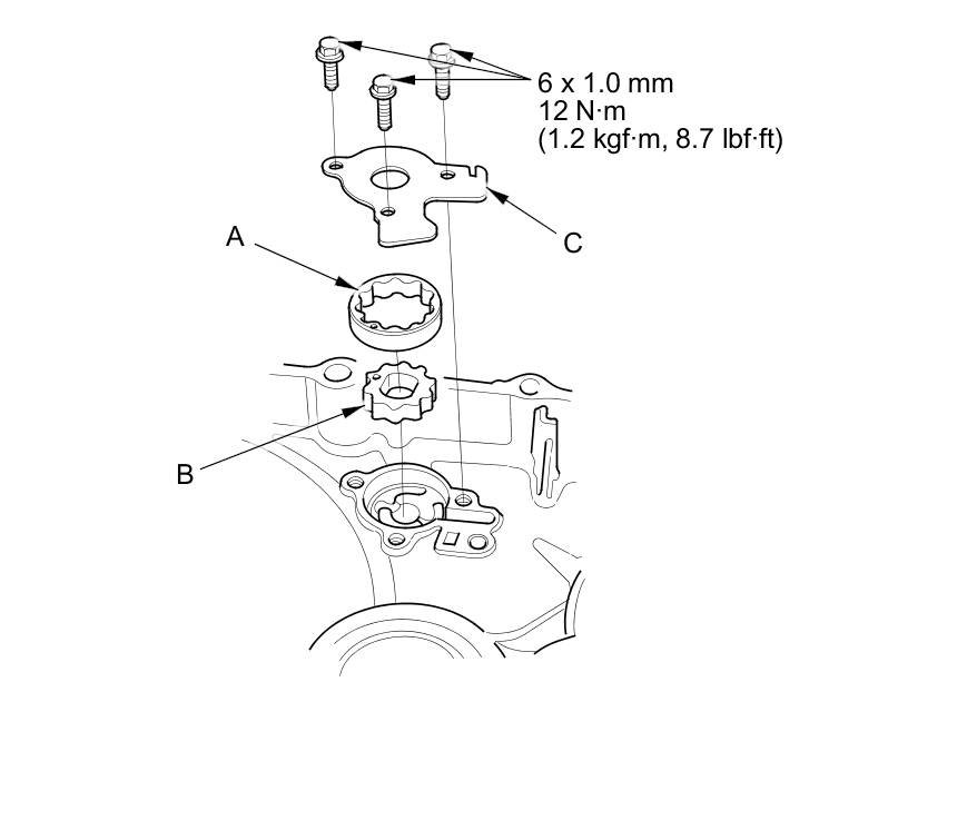 4. Install the oil pump outer rotor (A), the oil pump inner rotor (B), and the oil pump plate (C).