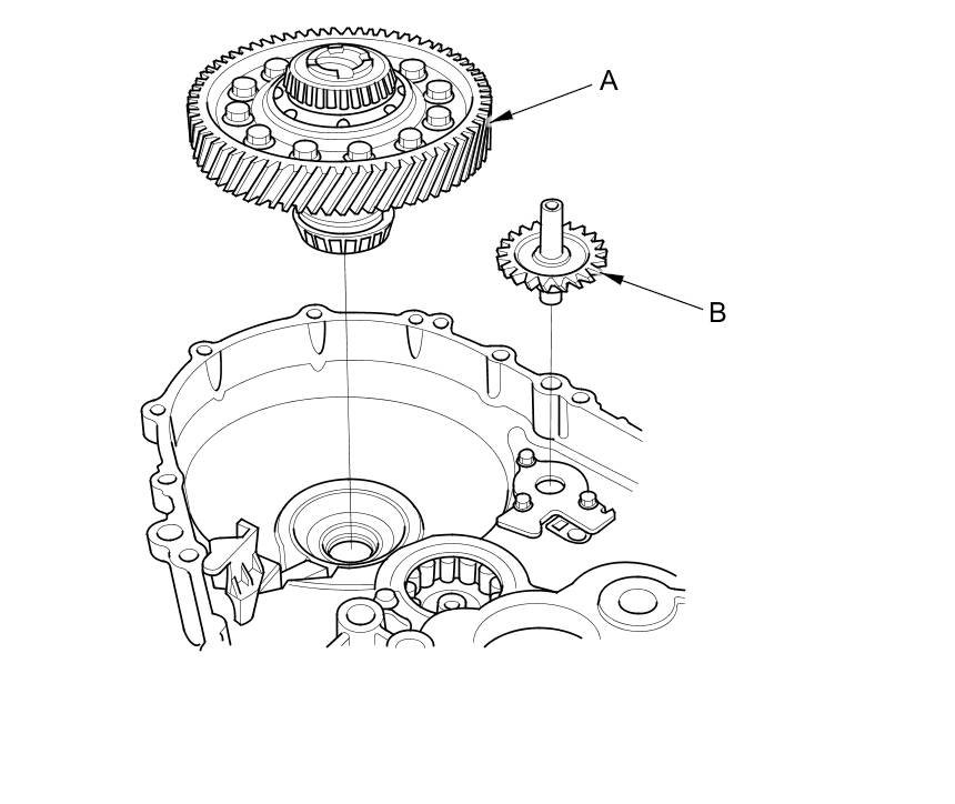 5. Install the differential assembly (A) and the oil pump shaft (B).