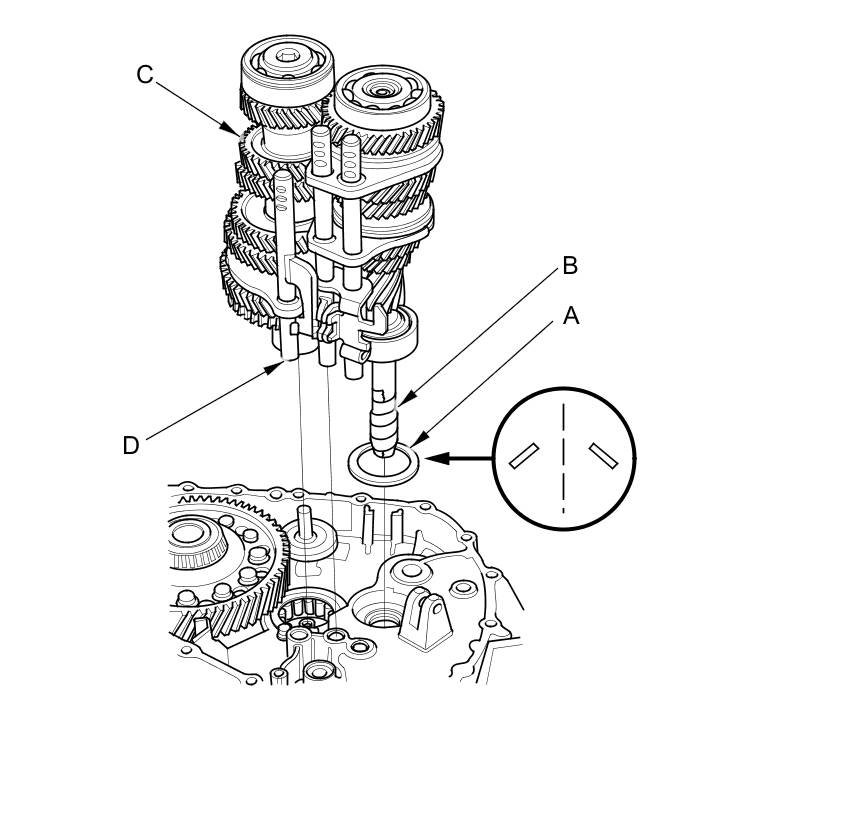 11. Assemble the 20 mm thrust needle bearings (A), the 20 mm thrust washers (B), the reverse idler gear shaft assembly (C), and the reverse shift fork (D) M/T Reverse Idler Gear Shaft Assembly Disassembly/Reassembly.