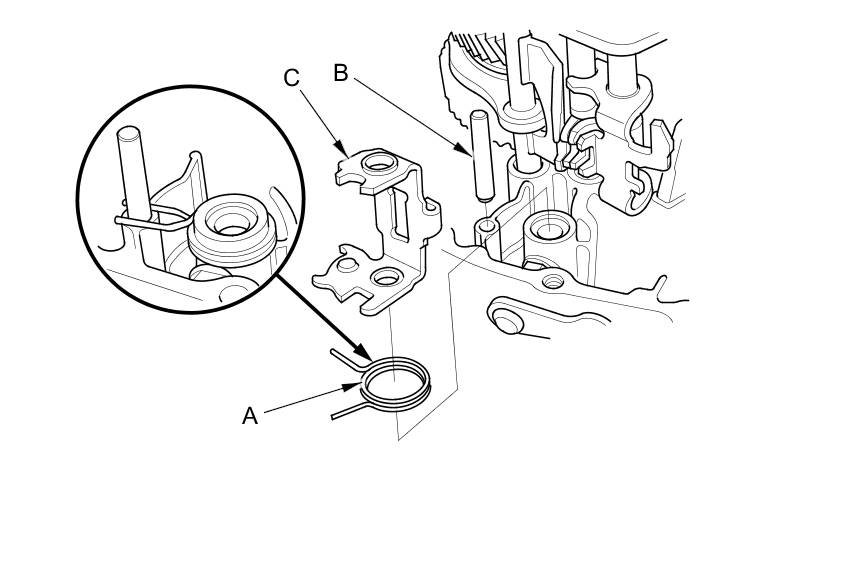 9. Set the select return spring (A), the 8 x 50 mm pin (B), and the interlock (C) as shown.