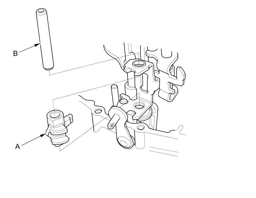 14. Install the reverse shift lever (A) and the 8 x 50 mm pin (B).