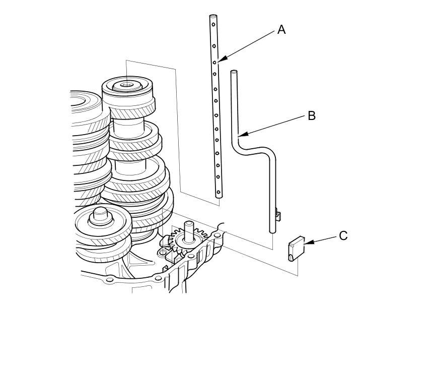 13. Slide the reverse idler gear shaft assembly (A) on the rib (B) of the clutch housing, then install it into the hole (C) of the clutch housing.
