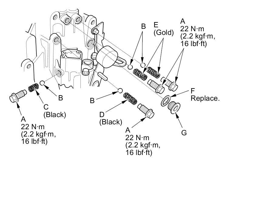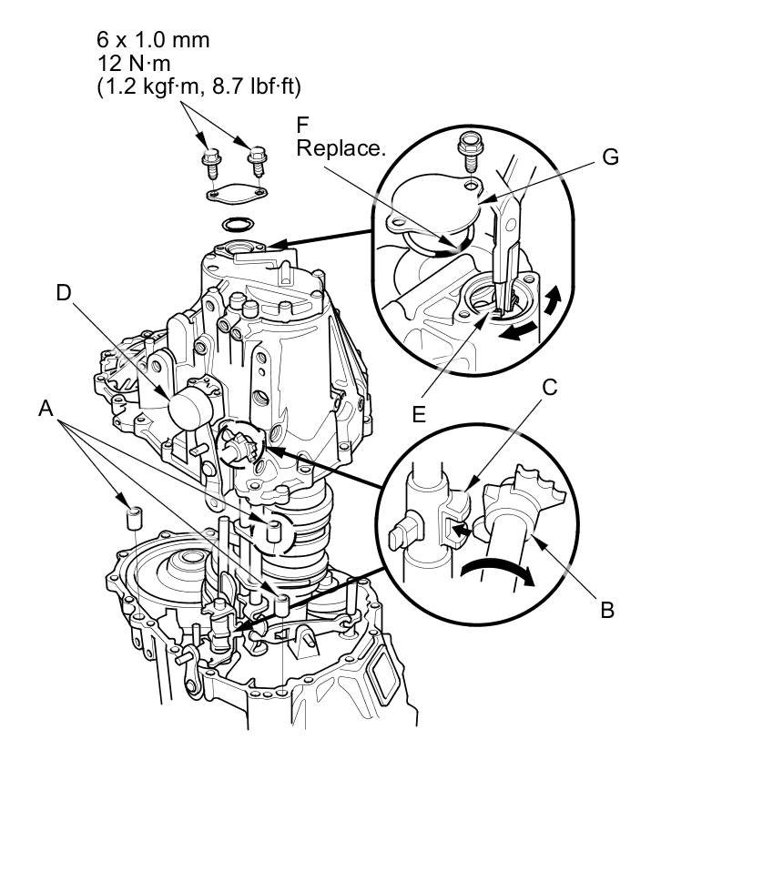 22. Install a new O-ring (F) and the transmission case cap (G).
