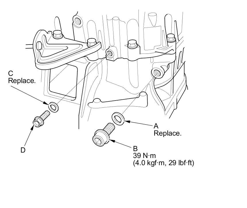 25. Install a new 14 mm sealing washer (A), the drain plug (B), and a new 6 mm sealing washer (C), and install the oil check bolt (D) by finger-tight.