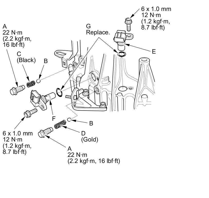 27. Install the input shaft (mainshaft) speed sensor (E), the output shaft (countershaft) speed sensor (F), and new O-rings (G).
