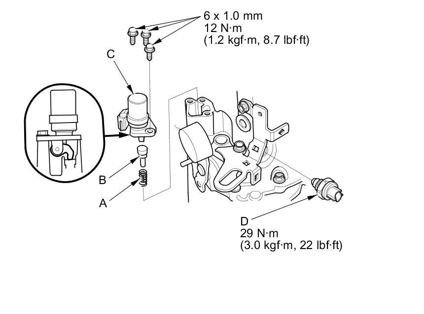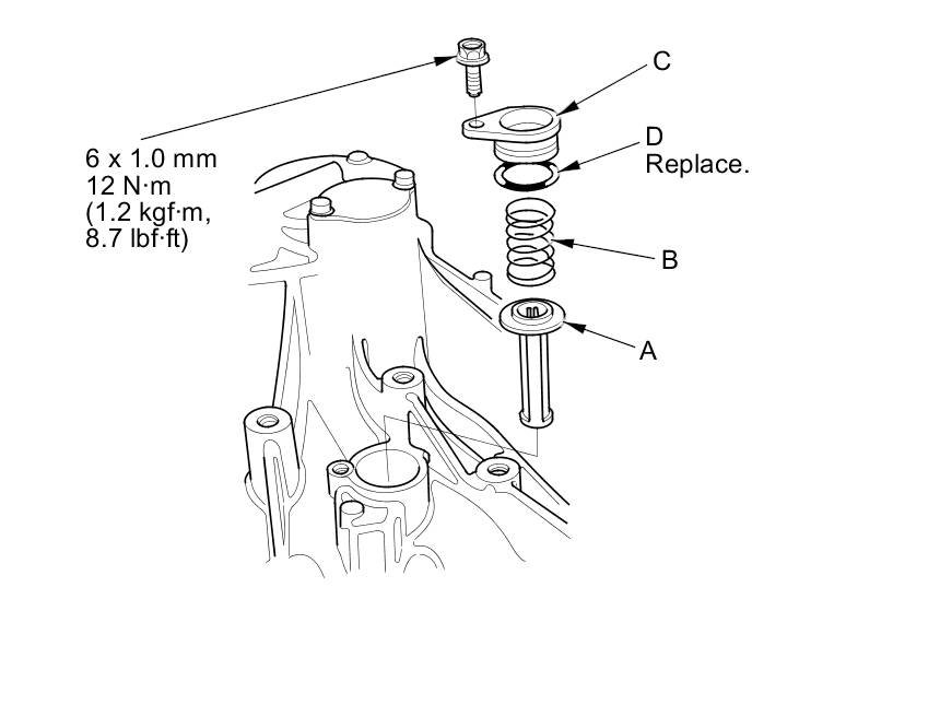 34. Install the oil pump strainer (A), the strainer set spring (B), and the strainer cover (C) with a new O-ring (D).