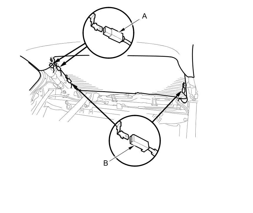 2. Disconnect the window antenna terminals (A) and the rear window defogger terminals (B).