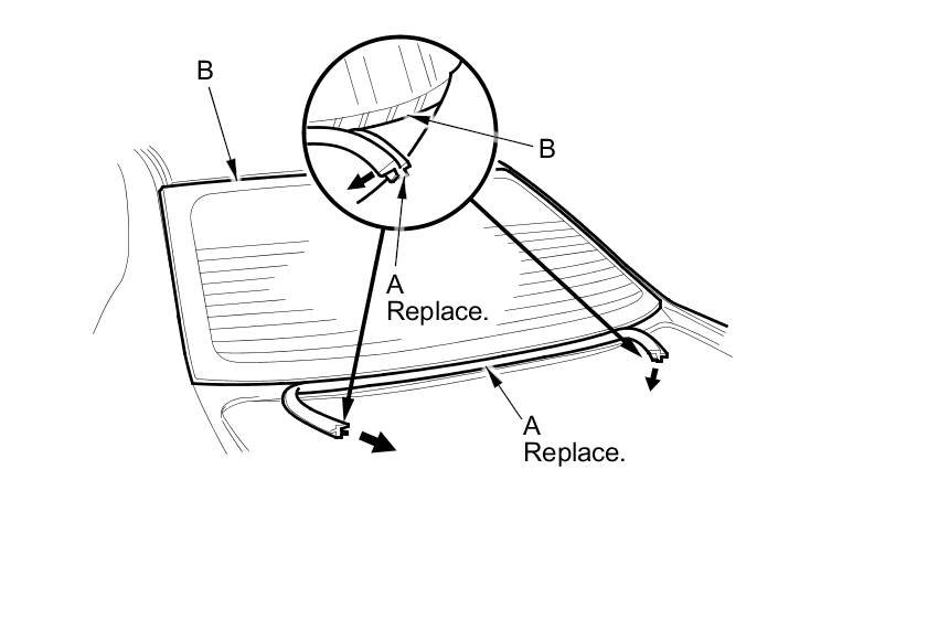 6. Remove the lower rubber dam (A) from the lower edge of the rear window (B). If necessary, cut the rubber dam with a utility knife.