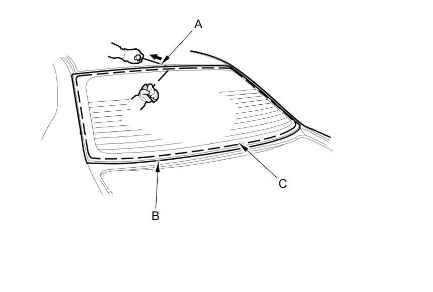 7. With a helper on the outside, pull the piano wire (A) back and forth in a sawing motion. Hold the piano wire as close to the rear window (B) as possible to prevent damage to the body, and carefully cut through the adhesive (C) around the entire rear window.