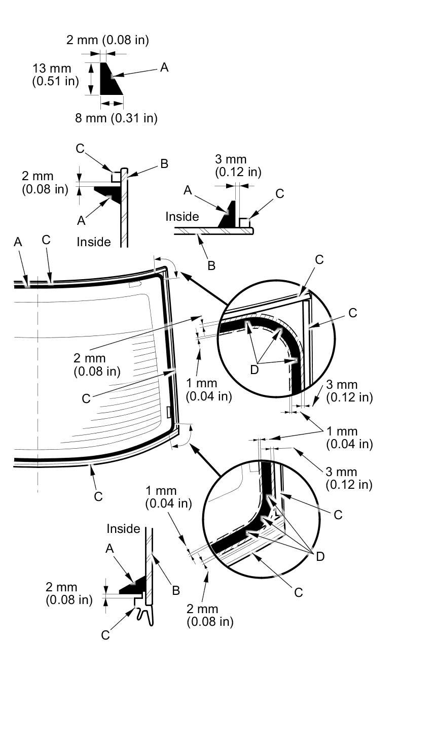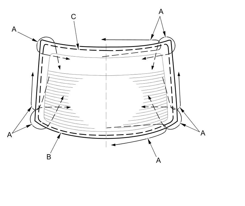 12. Apply glass primer to the edge of the rear window (A) where the lower rubber dam (B) will be attached as shown. Attach the lower rubber dam with the adhesive tape (C) to the lower edge of the rear window: