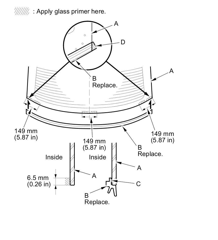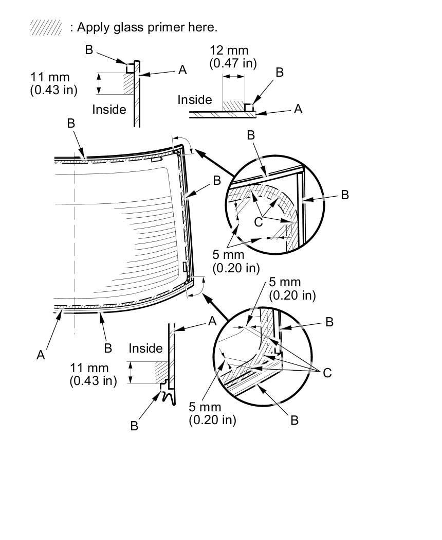 - Apply glass primer to the corner area of the rear window using the printed dots (C) on the rear window as a guide.