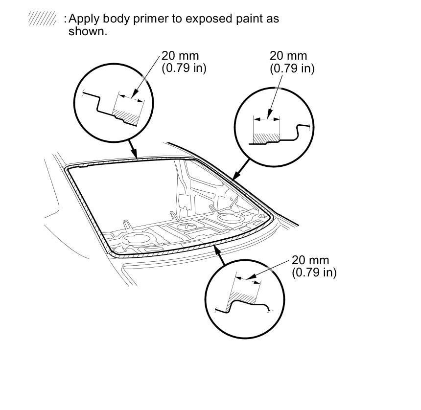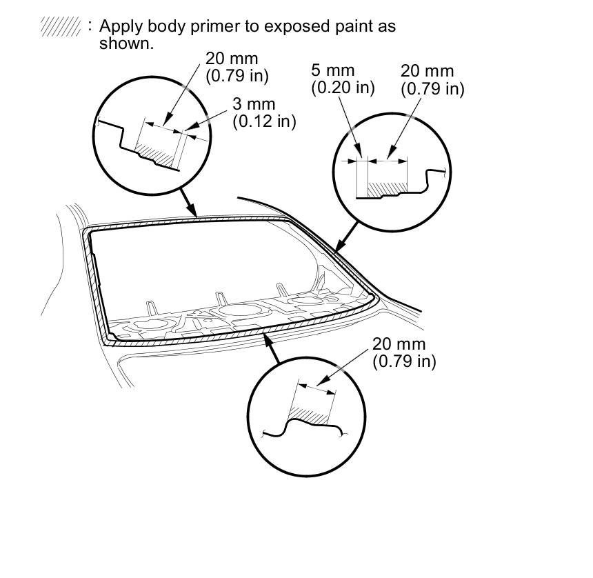 - Do not apply body primer to the rear window, and do not mix up the body and glass primer applicators.