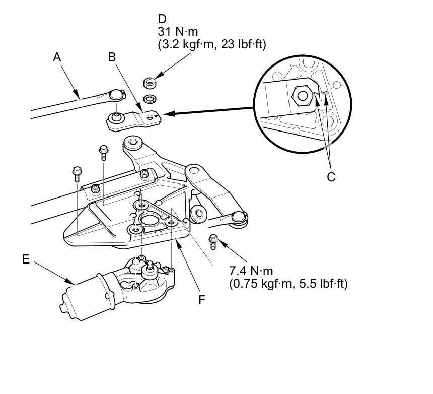 6. Remove the three bolts, and separate the windshield wiper motor from the linkage (F).