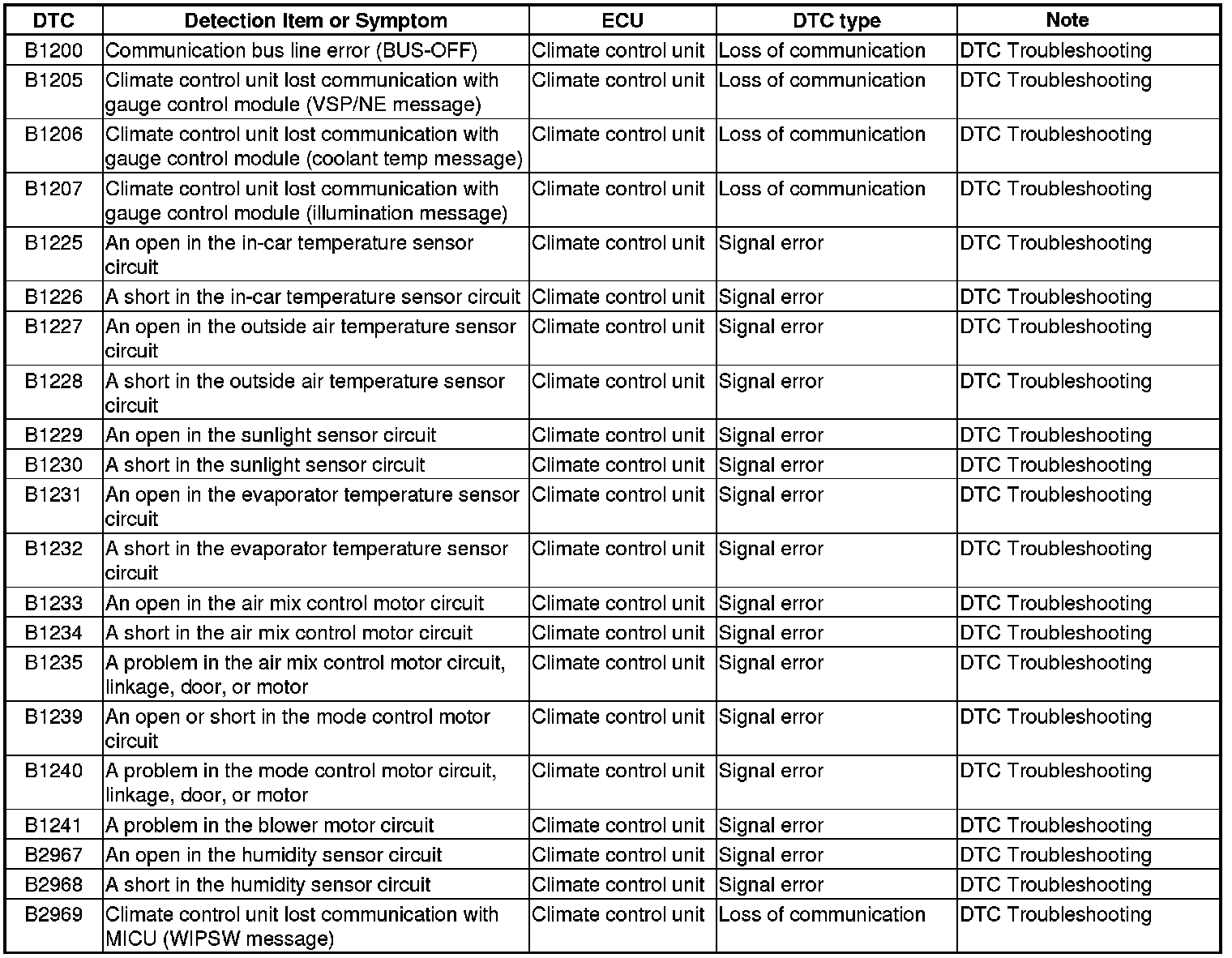 Climate Control System DTC Troubleshooting Index
