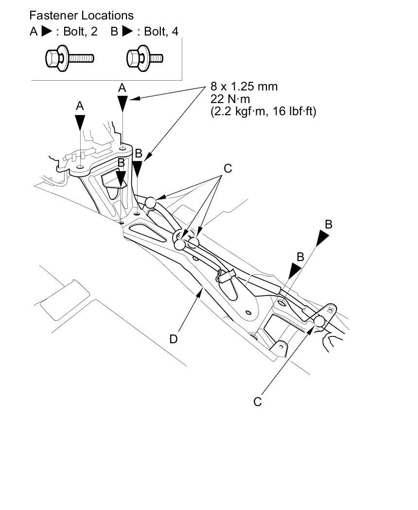 2. Remove the bolts (A, B) and detach the harness clips (C), then remove the base bracket (D).