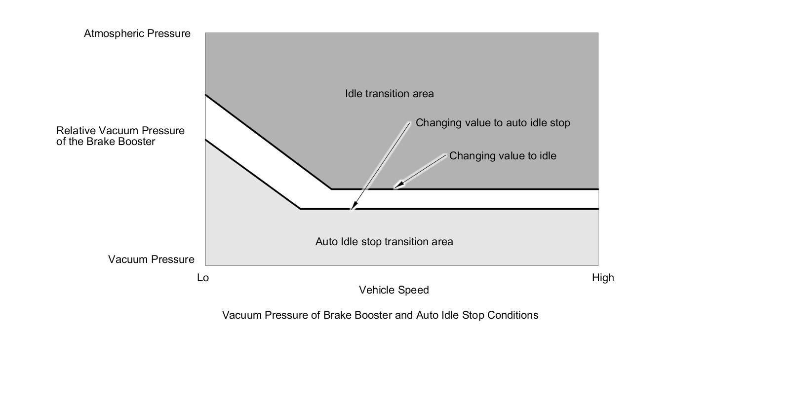 The brake booster vacuum must reach the established point to ensure enough braking force to allow for auto idle stop activation. If the established value is decreased to the extent that braking force cannot be ensured, the engine will transition from auto idle stop to the engine idling.