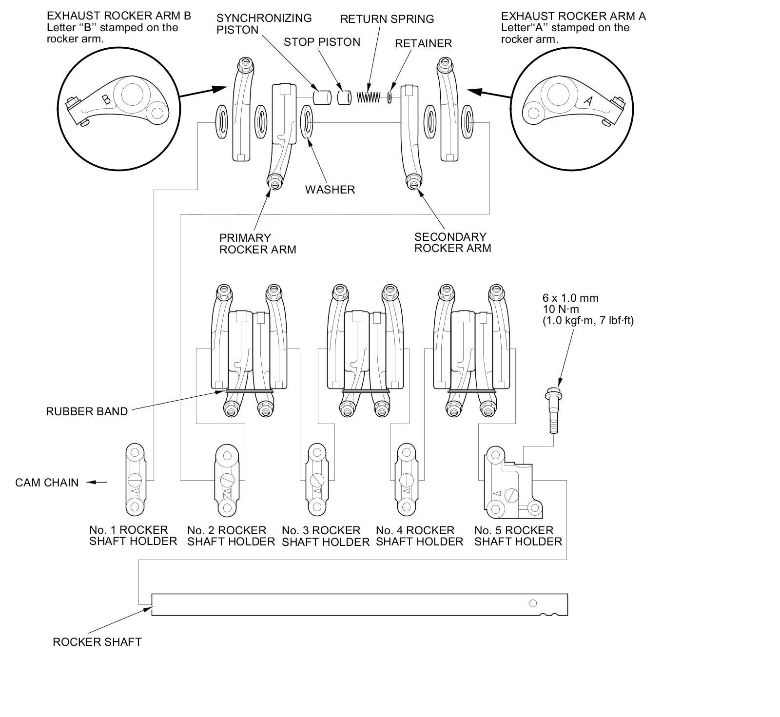 - When reassembling the rocker arm and shaft assembly, position the arrows on the rocker shaft holders facing the cam chain side.