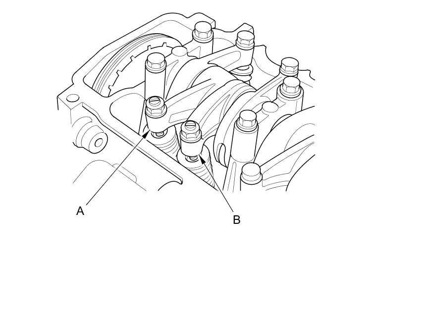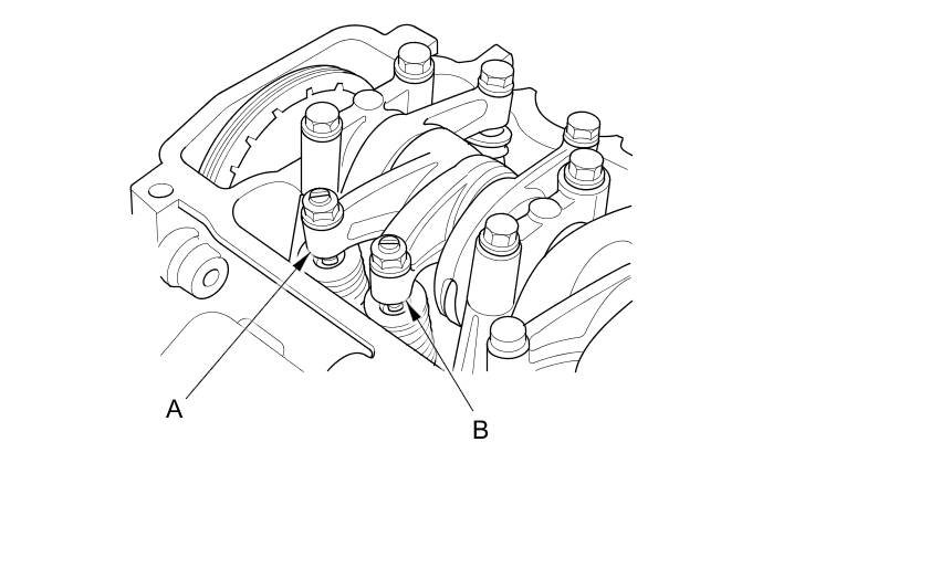 7. With the specified air pressure applied, rotate the crankshaft pulley clockwise. The primary rocker arm (A) should move together with the secondary rocker arm (B):