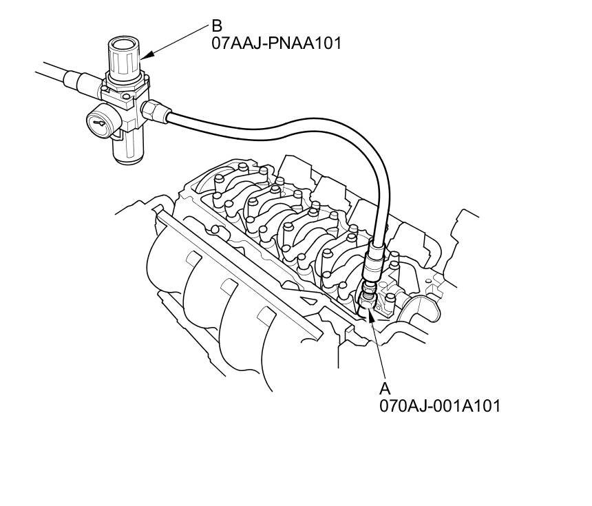 5. Install the VCM air adapter (A) to the inspection hole, then connect the air pressure regulator (B).