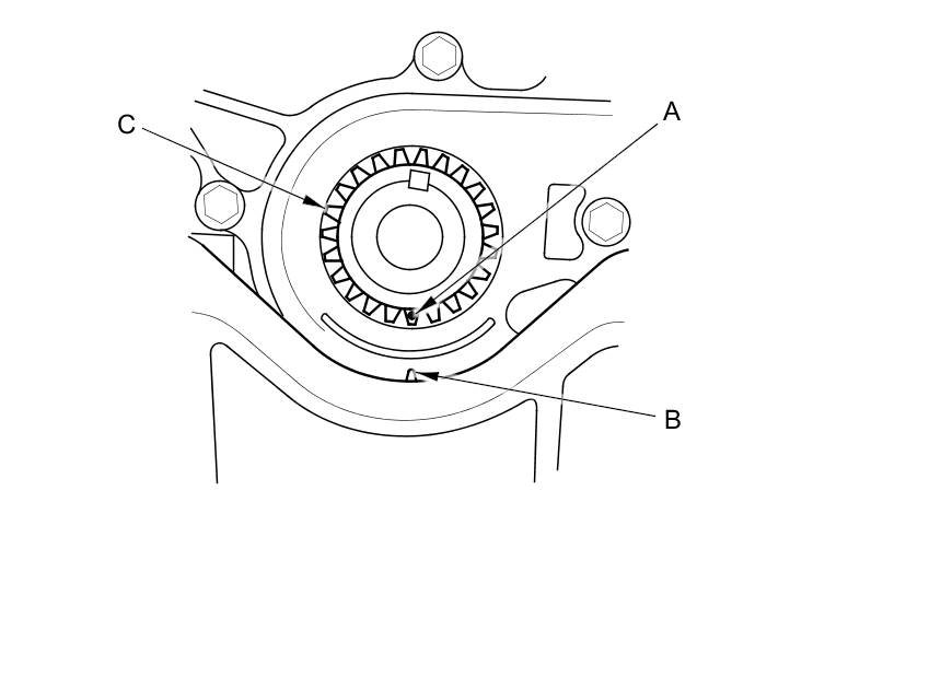 1. Set the crankshaft to top dead center (TDC). Align the TDC mark (A) on the crankshaft sprocket with the pointer (B) on the oil pump.