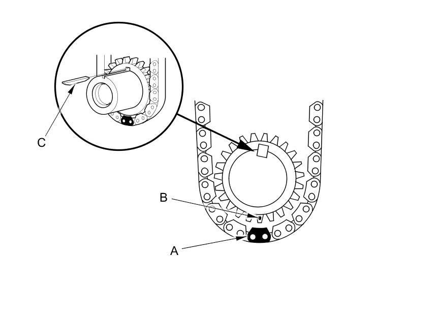 4. Install the cam chain on the crankshaft sprocket with the colored piece (A) aligned with the TDC mark (B) on the crankshaft sprocket, then install the crankshaft sprocket with the special key (C) to the crankshaft.