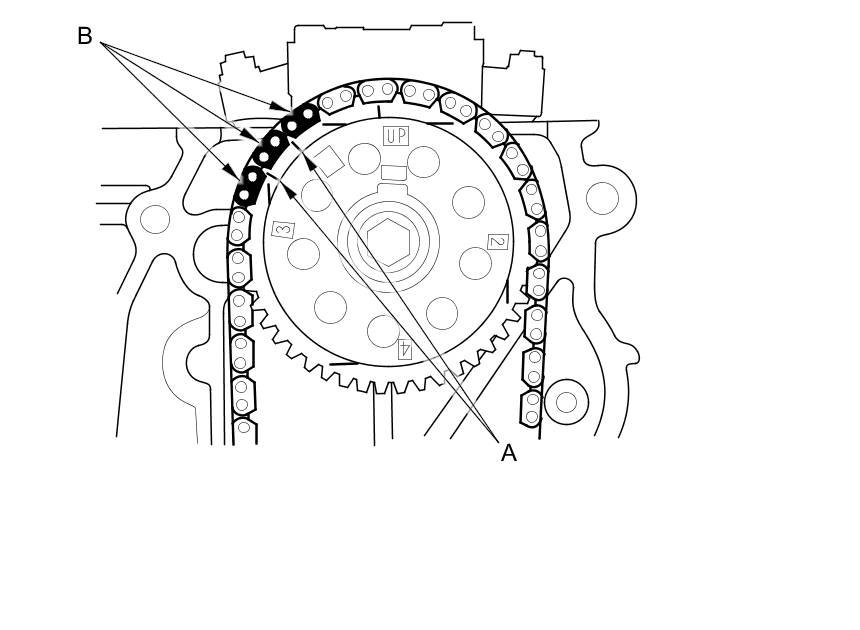 3. Set the camshaft to TDC. The "UP" mark (A) on the camshaft sprocket should be at the top, and the TDC grooves (B) on the camshaft sprocket should line up with the top edge of the head.