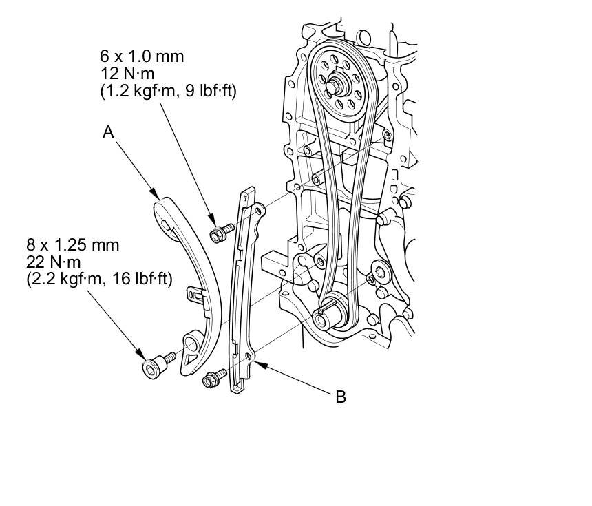 6. Install the cam chain tensioner (A) and the cam chain guide (B).