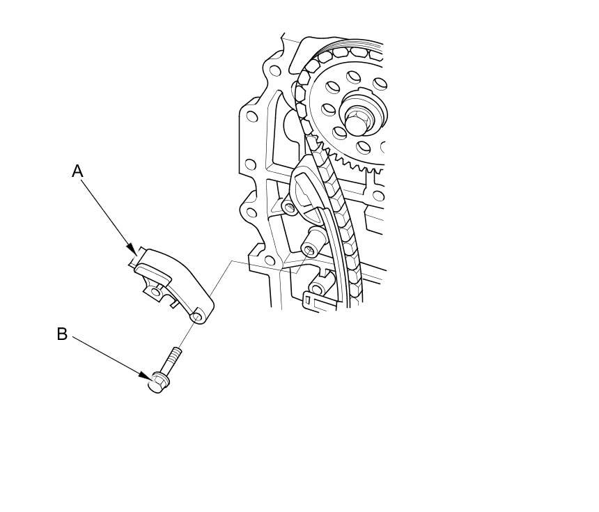 7. Install the cam chain tensioner slider (A), and loosely install the bolt (B).