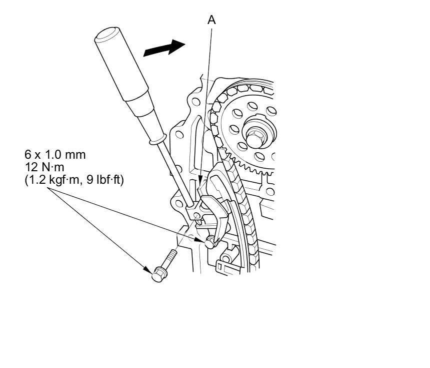 9. Rotate the cam chain tensioner slider clockwise to compress the cam chain tensioner, and install the remaining bolt, then tighten the bolts to the specified torque.