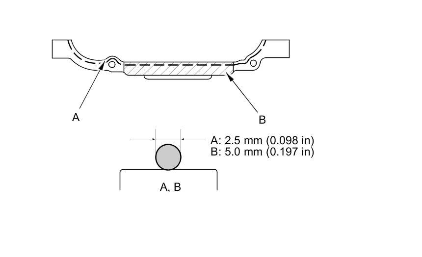 - Apply a 5.0 mm (0.197 in) diameter bead of liquid gasket to the shaded area (B).