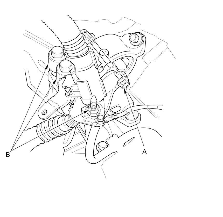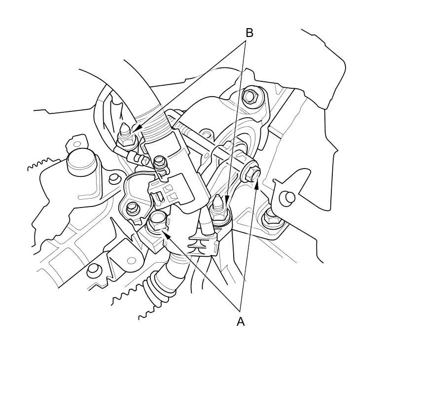 23. Loosen the transmission mount bracket mounting bolts (A) and nuts (B).
