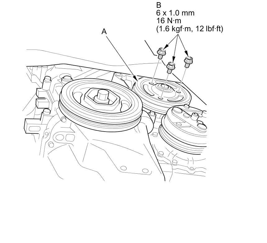 35. Install the water pump pulley (A), and loosely install the water pump pulley mounting bolts (B).