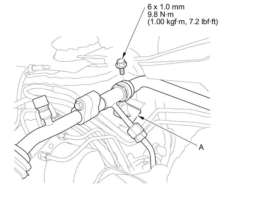 3. Remove the bolt, then disconnect the A/C line (A) from the evaporator core, and the O-rings (B).