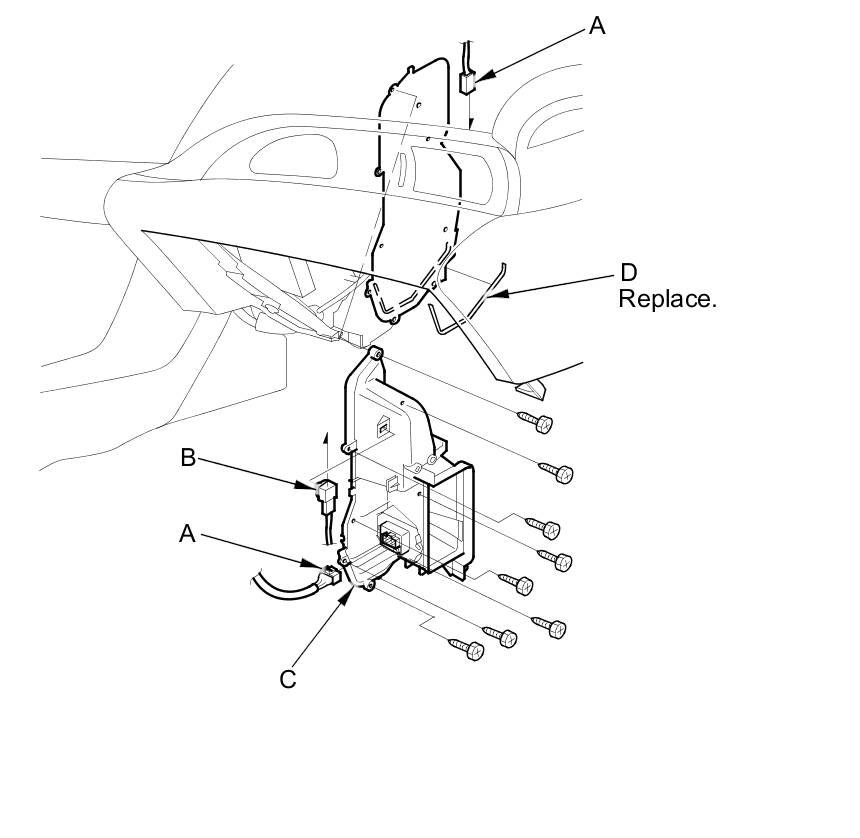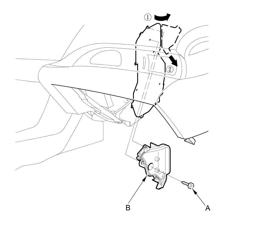 6. Remove the self-tapping screw (A), push the upper cover (B) toward the front of the vehicle, then remove the upper cover.