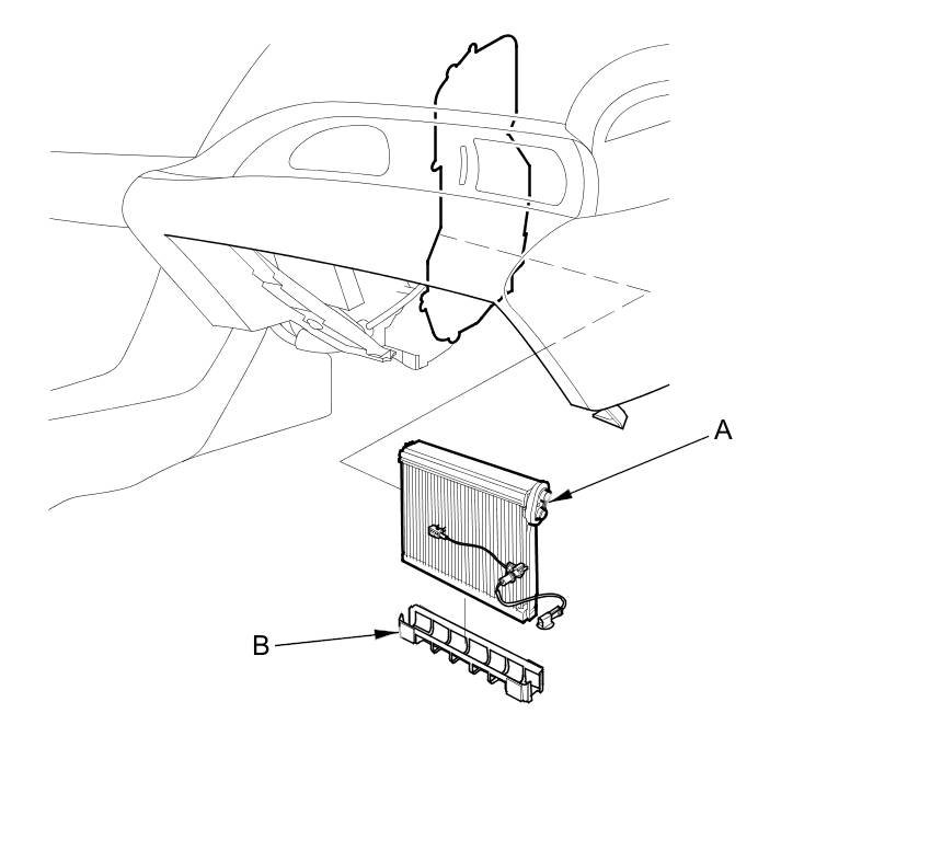 8. Carefully pull out the evaporator core assembly (A), then remove the plate (B).