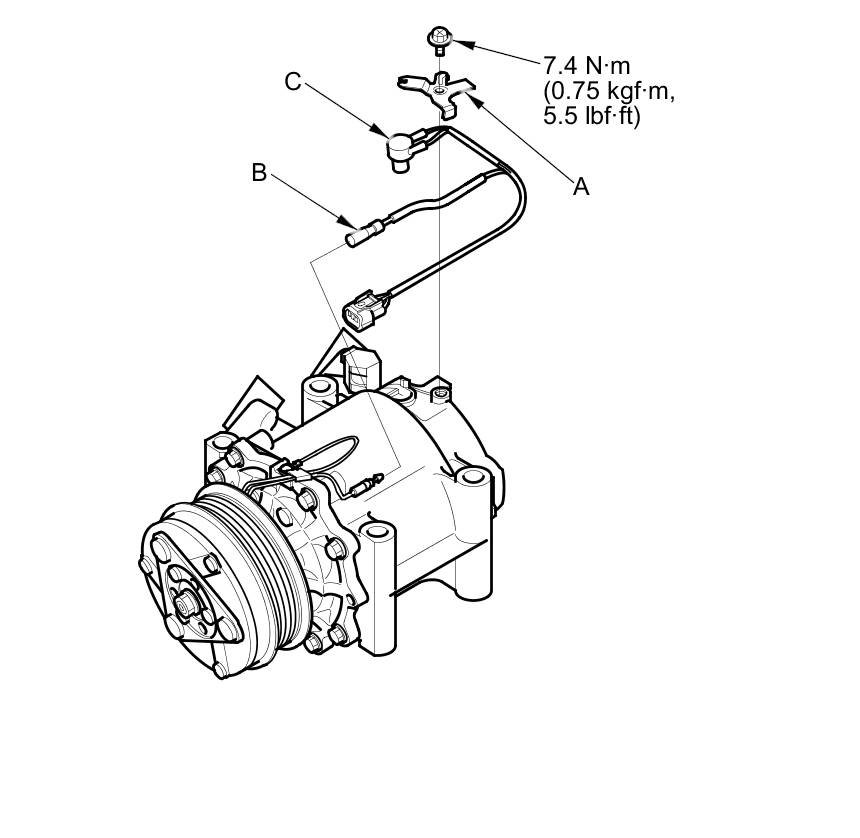 1. Remove the bolt and the holder (A). Disconnect the field coil connector (B), then remove the thermal protector (C).