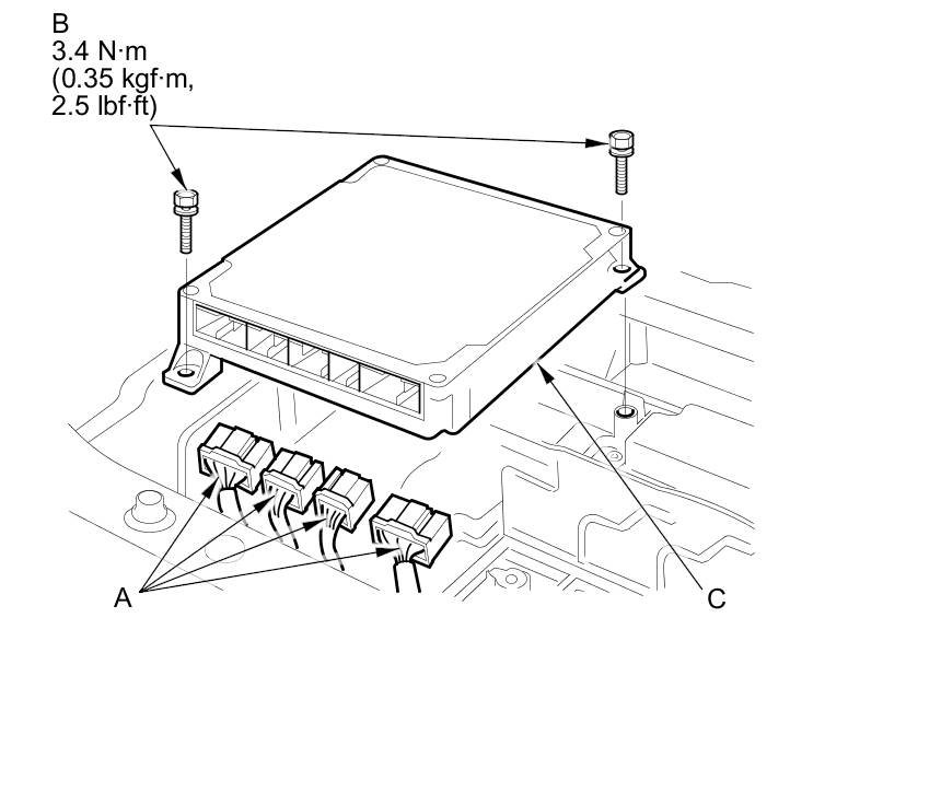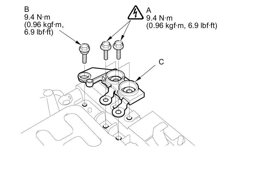 9. Remove the bolts (A, B) and the PCU busplate (C).