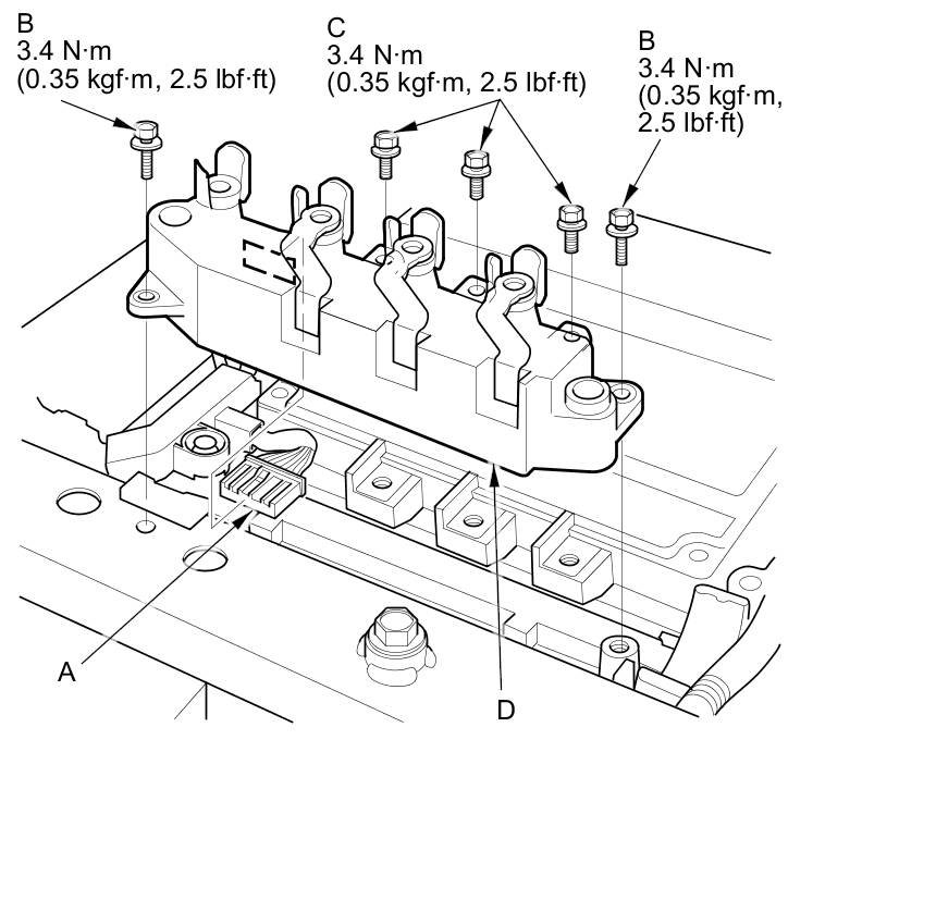 3. Remove the bolts (B, C) and the phase motor current sensor (D).