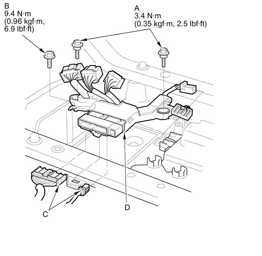 5. Disconnect the connectors (C), then remove the PCU wire harness (D).