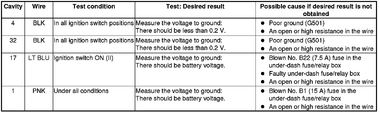 9. Reconnect the connector to the gauge control module, turn the ignition switch to ON (II), and do the following input tests: