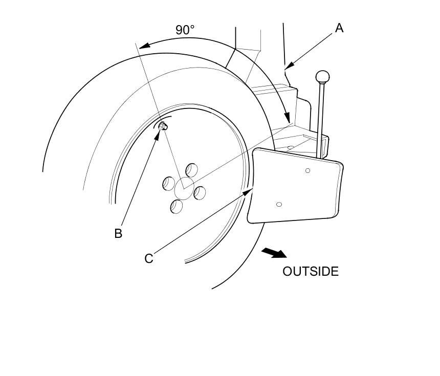 - Position the wheel as shown so the valve stem (B) is 90 degrees from the bead breaker (C) as shown.