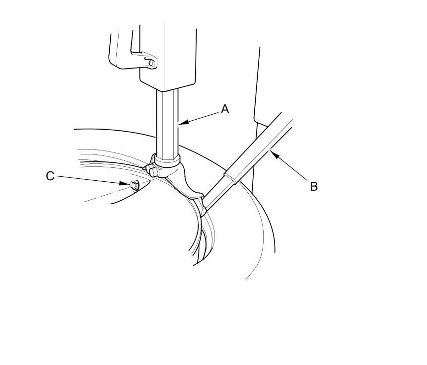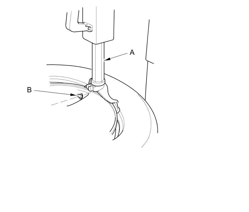 5. Position the wheel so the tire machine (A) and the tire iron (B) are next to the valve stem (C) and will move away from it when the machine starts. Then remove the tire from the wheel.