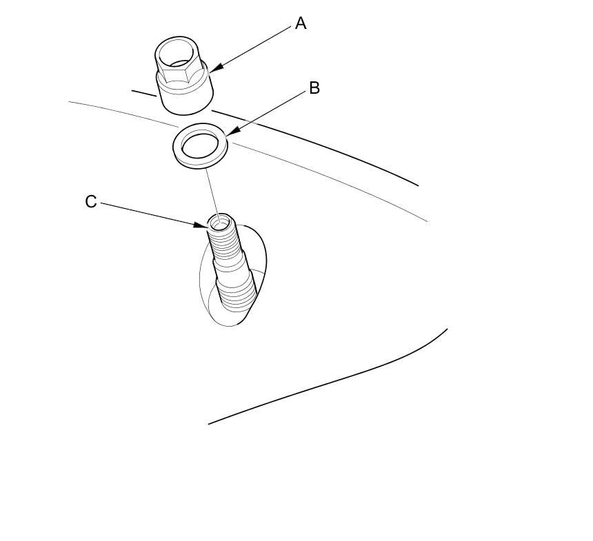 6. Remove the valve stem nut (A) and the washer (B), then remove the tire pressure sensor with the valve stem (C) from the wheel.