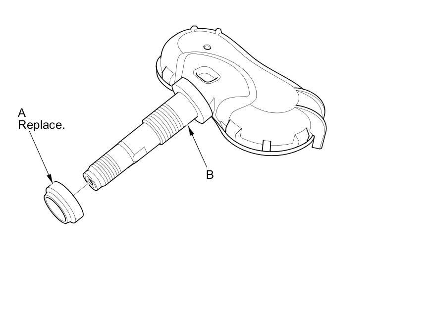 7. Remove and discard the valve stem grommet (A) from the tire pressure sensor (B).