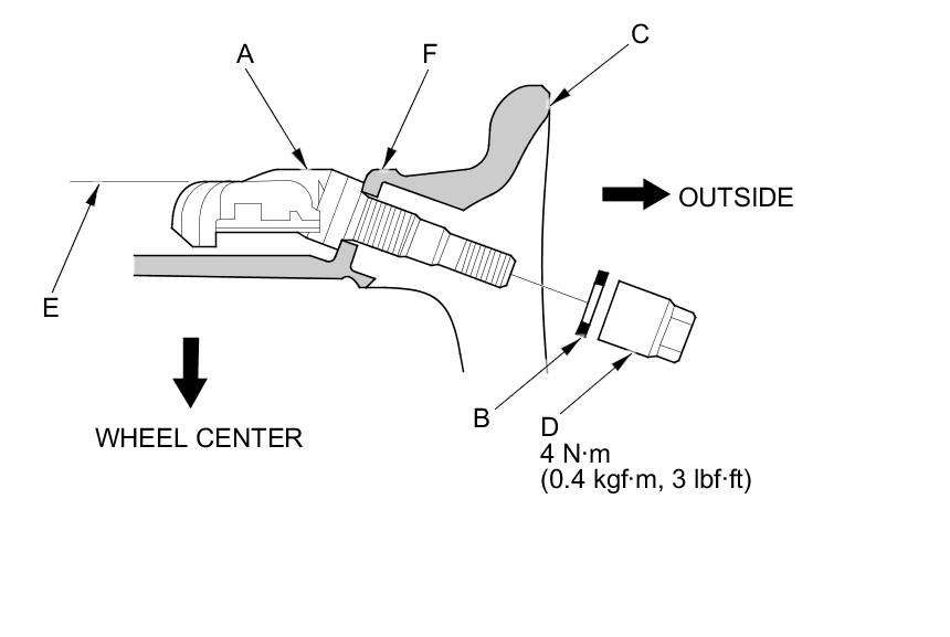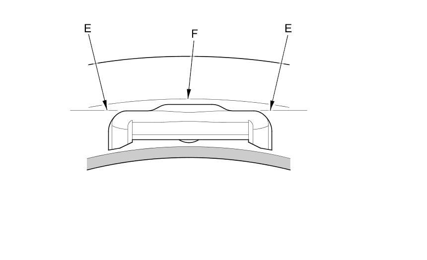 NOTE: Install the tire pressure sensor so that the sensor housing surface (E) does not extend beyond the protrusion (F) on the wheel to prevent the sensor housing from being caught on the bead of the tire when assembling the tire.